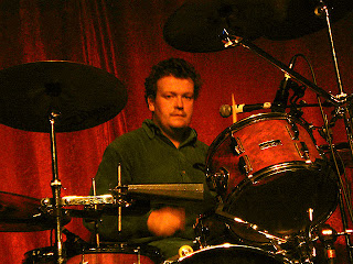 RINGO STALINSo it's not a moment too soon that I flee that potential disaster as I drop in next door at Enigma at 9:30PM to catch the first opening act here for the night, Ringo Stalin. From as much as I can gather it's essentially a solo act, featuring lead singer "Ringo Stalin" (who appears to be a reject from early 90's comedy act the Doug Anthony Allstars) who's joined on stage by a revolving door of guest musicians, including here for the night: Matt Hayward on guitar (formerly from Central Deli Band), Peter J Gravestock on bass (from Bit By Bats) and some random chick (not seen here) who briefly appears for some backup vocals. As much as I can figure, it sounds like Nick Cave's early 80's art-trash band The Birthday Party remixed by Kraftwerk, or if you want a really obscure reference that'll likely fly right over your heads, think Wall of Voodoo and their nerd rock hit "Mexican Radio" from 1982 and you'd really hit the nail on the coffin. As such, most of this minimal art-trash electro would've equally gone over most of your heads: I spotted a cover of Warren Zevon's "Werewolf in London", some weirdarse mariachi influences, quite possibly a trace of Devo.. oh, and that sound you hear right now? that would be my head exploding trying to come to terms with all this shit. Still as much as it may just be complete and utter art wank of the highest order, overall I actually quite like it.
